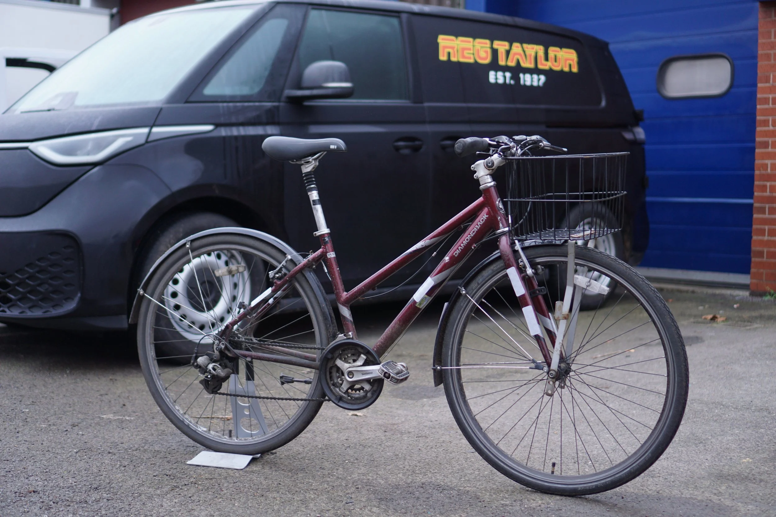 We serviced this road bike four months prior, but with regular use on pot-holed roads, the front wheel needed truing, a puncture repair and the brake shoes replacing. The bike was cleaned and the worn components replaced with new (brake shoes and inner tube). This took one and a half hours (£52.50 labour), and with parts came to £70.50: